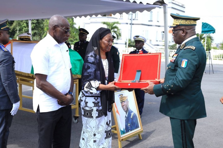 Décédé le 27 janvier 2026, à Abidjan, le général de division aérienne à la retraite Aka Kodjo Marc, a eu droit à un ultime hommage de ses frères d'armes. En effet, indique une note d’information, les Forces armées de Côte d’Ivoire (FACI) ont activement participé à ses obsèques. Lors de la présentation des condoléances, le lundi 2 mars 2026 au domicile du défunt dans la commune de Cocody, le Général d'Armée Lassina Doumbia, Chef d'Etat-Major général des Armées (CEMGA), a la tête d’une forte délégation, a exprimé la solidarité de l’institution militaire à la famille éplorée. Toujours en hommage à l'illustre disparu et en soutien à sa famille, une veillée militaire a été organisée à la salle de conférence de l’État-Major général des Armées le 5 mars 2026, après la levée de corps à la salle Félix Houphouët-Boigny d’IVOSEP Treichville. A suivi la cérémonie d’honneurs funèbres militaires, le vendredi 6 mars 2026 à la place d’arme Général de corps d’armée Général Ouattara Paul Thomas d’Aquin de l’Etat majors général des Armées au Plateau. Cette cérémonie présidée par le CEMGA en présence des membres de la famille du défunt, des frères d’armes, proches et amis, marque « l’ultime adieu des FACI à feu Aka Kodjo Marc », Indique également la note d’information. Cette cérémonie a été également l’occasion de décorer le défunt à titre posthume, de la « médaille des Armées, échelon Or,