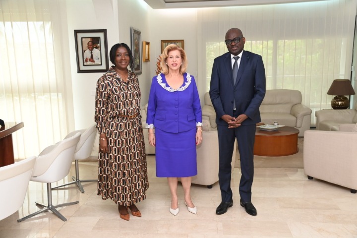La Première Dame, Mme Dominique Ouattara a reçu en audience Mme Roberta Di Lecce, ambassadrice d’Italie et Paul Benoit Saar Ambassadeur du Sénégal en Côte d’Ivoire, le 31 mars 2026 à son cabinet de Cocody.